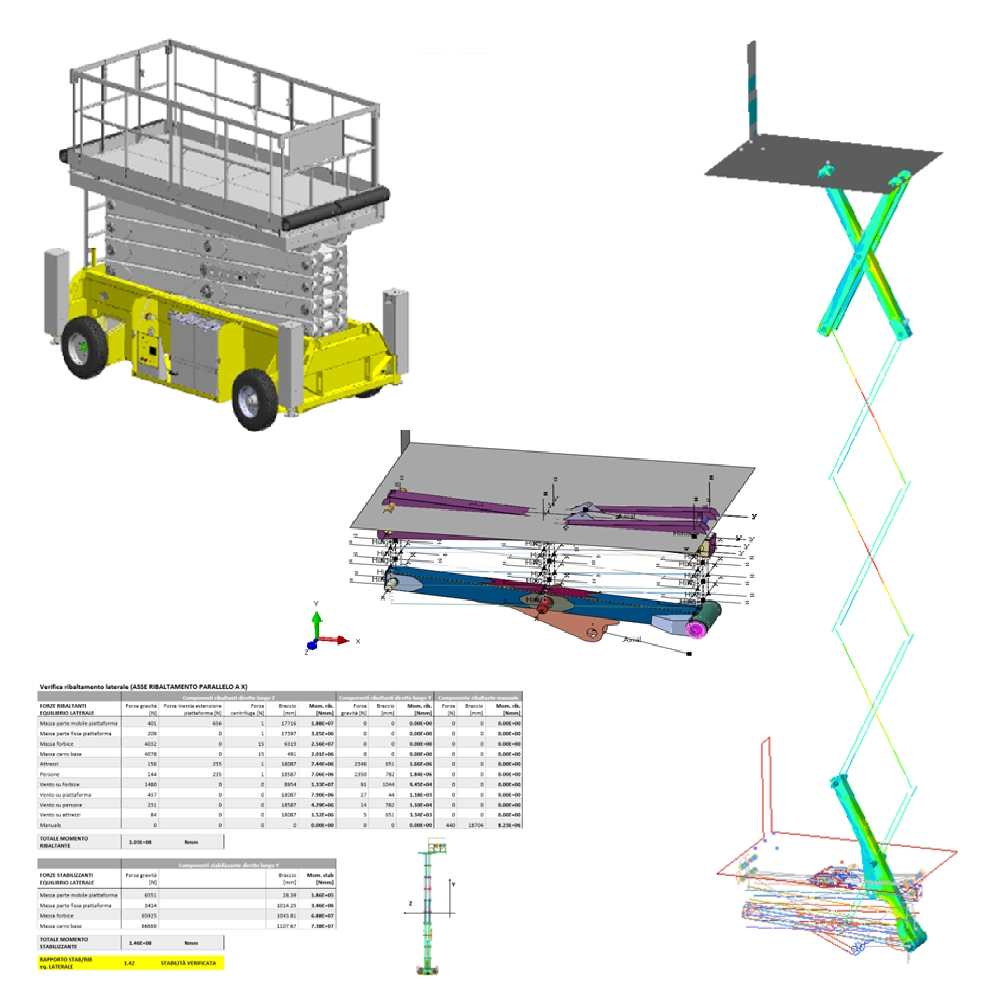 L’attività ha riguardato la progettazione della struttura di sollevamento persone. Partendo dallo studio delle normative EN280 e EN13001 si è elaborato un foglio di calcolo della stabilità della struttura e per la verifica strutturale dei profilati e componenti. Una successiva fase di analisi strutturali statiche e dinamiche ha permesso un calcolo di dettaglio delle sollecitazioni agenti sulla struttura per arrivare al dimensionamento finale.